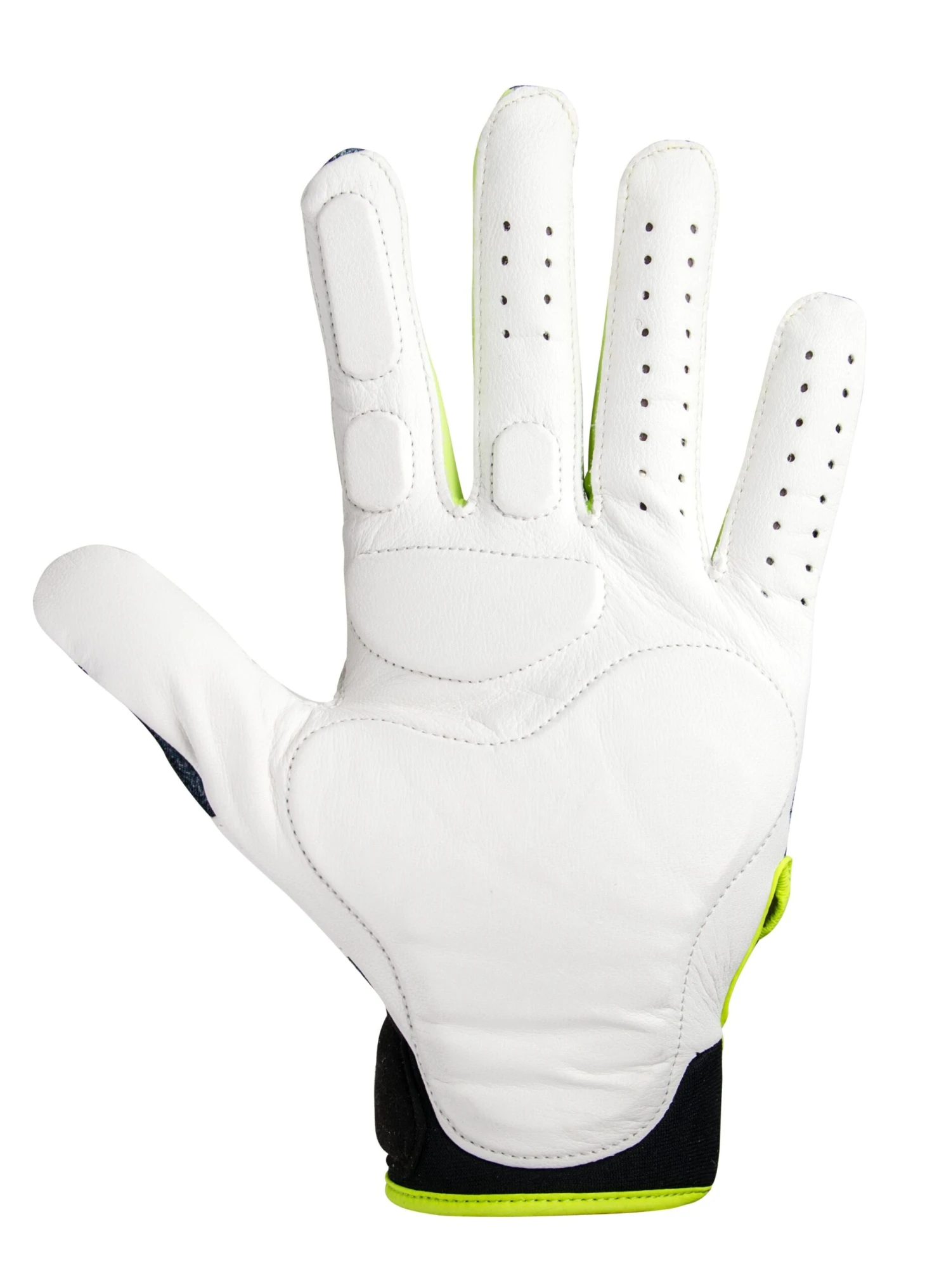 Palm of hand is constructed with white goat skin leather and the back is a seamless moisture wicking stretch.