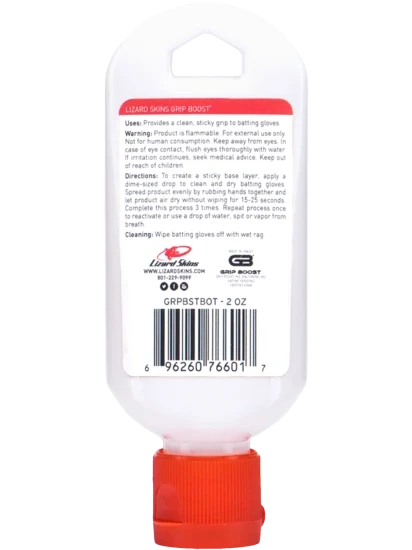 The Lizard Skins Grip Boost® batting gel is a quick drying, alcohol-based gel that gives batters the extra grip and superior bat control they need without the mess of other grip enhancers. It works by applying a thin tacky polymer layer to the palm of the glove. It’s clear, easy to clean and doesn’t leave any residue. Performance is not dependent on temperature and the tackiness can be reactivated by moisture.