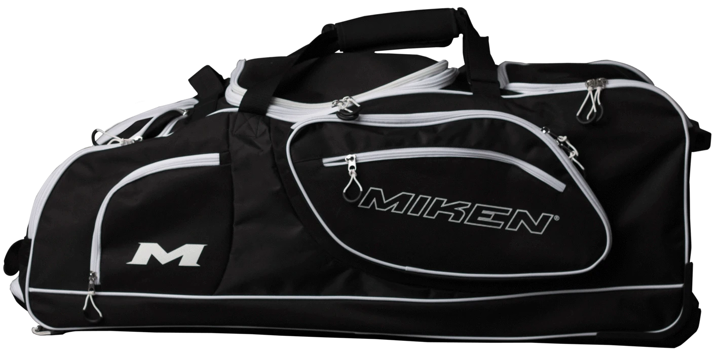 The Championship wheeled equipment bag holds up to 4 bats and is made from a durable 600D polyester material with a wide set tank wheels. In addition to the main compartment, it gives you a vented cleat compartment, two zippered mesh pockets inside and side pocket for more storage. Finish it off with molded “J” fence hooks and a telescoping handle to pull it from tournament to tournament