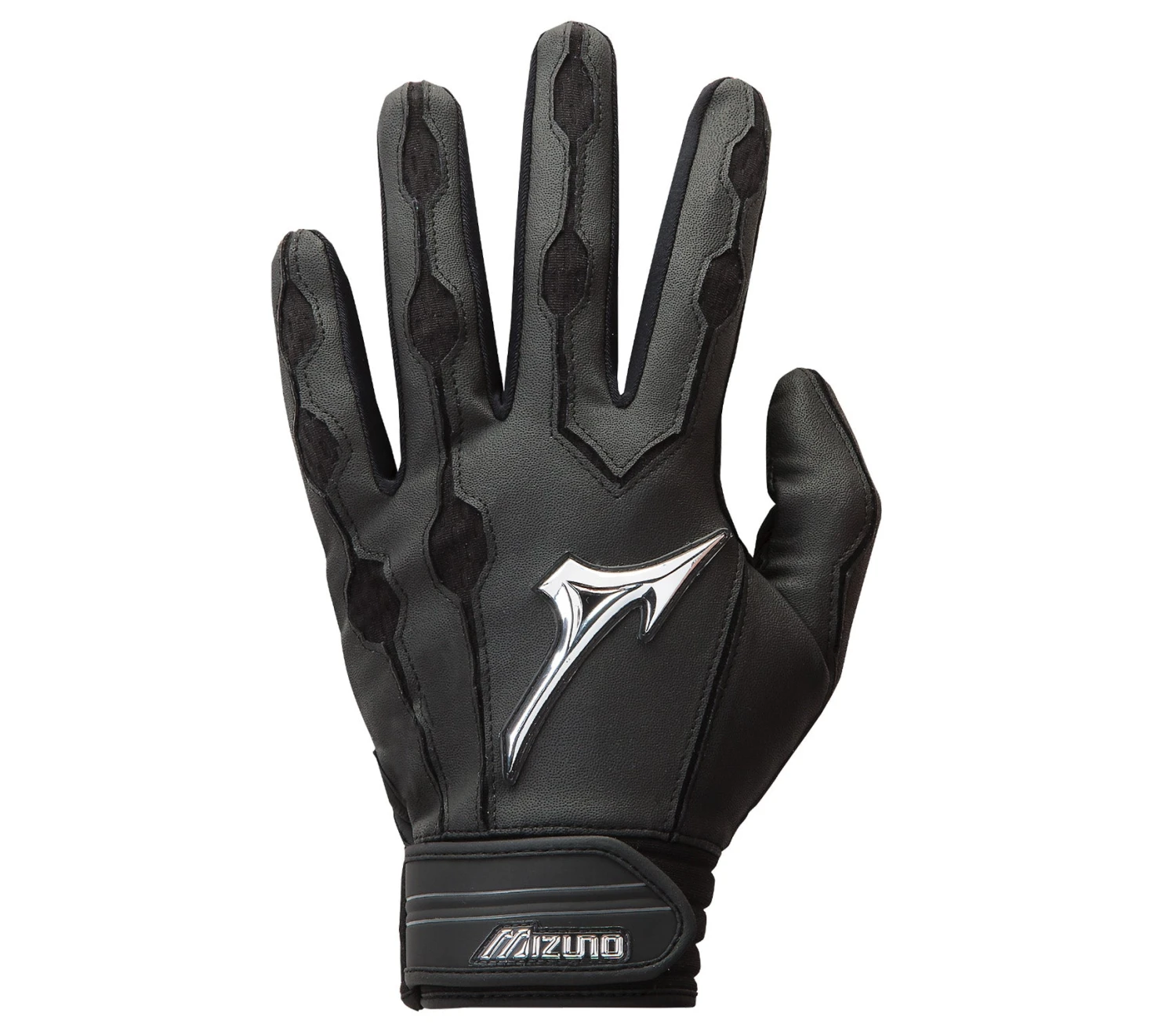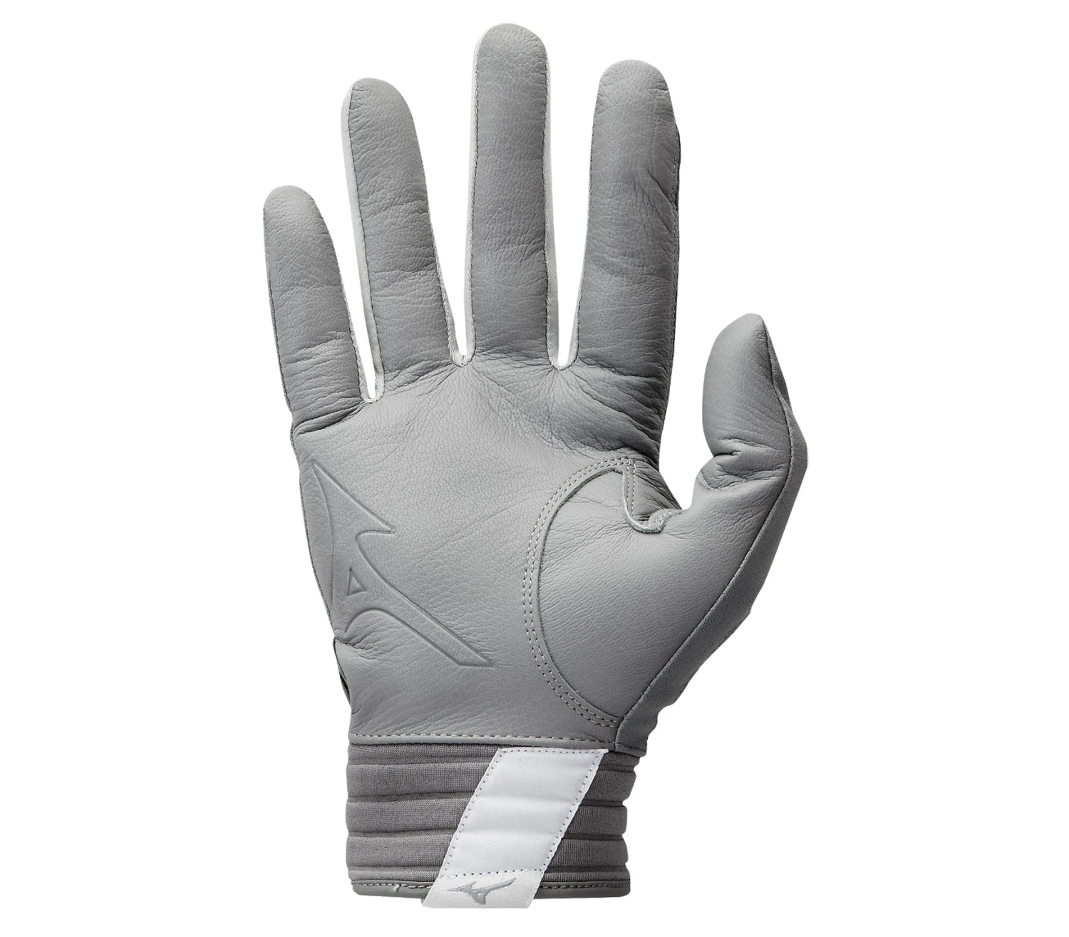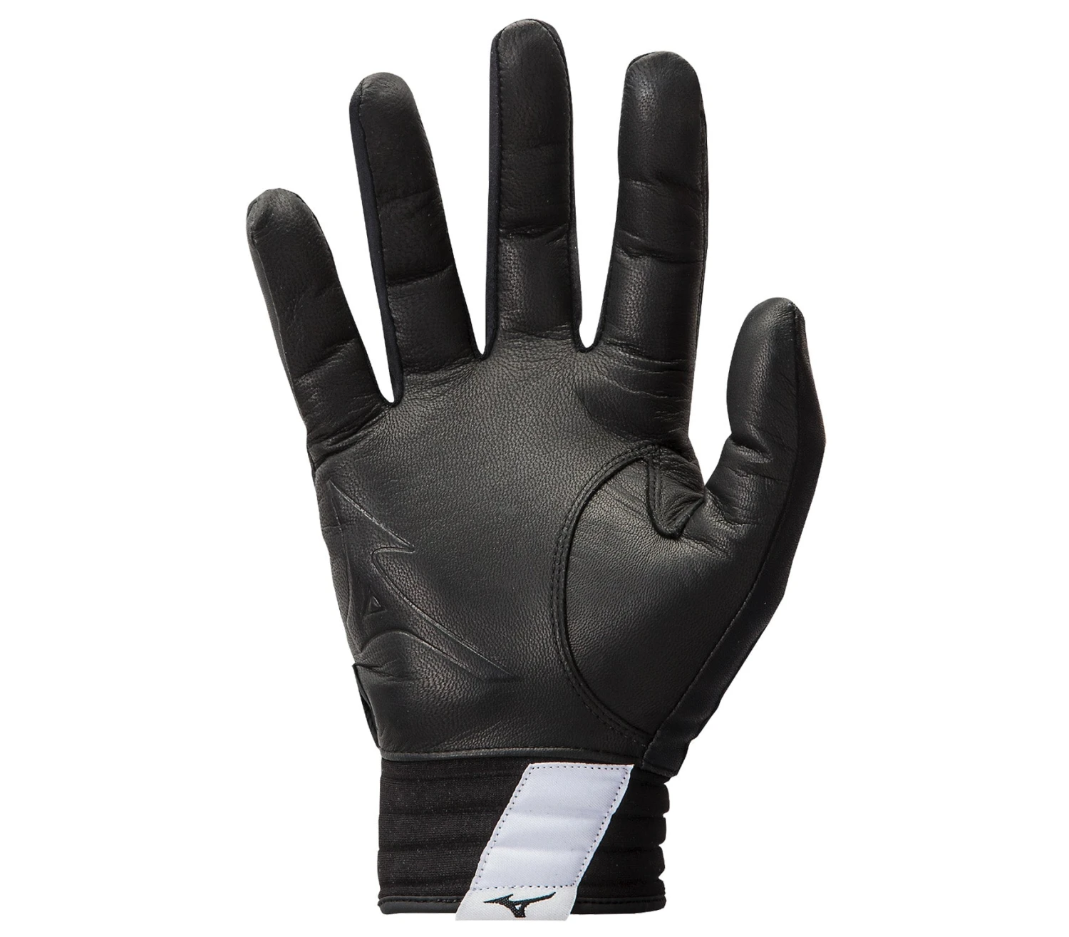 Leather palm used for combination of great feel with durability. Mizuno AirMesh utilized for maximum flex and breathability. QuikAdjust wrist tab molded pull tab for secure fit. 3-D chrome logo applications for rich professional look. Compression molded neoprene wristband with PNP (Personalized Number Plate) for player customization option.