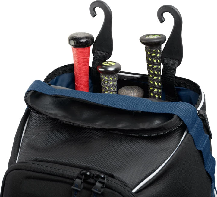 This wheeled catcher’s bag is extremely versatile, and perfect for carrying all your gear to the game. It features a main storage compartment for your catcher’s gear and helmet, as well as a separate, hard molded pocket to keep your glove protected, and can hold up to four (4) bats. Its full bottom rails with rugged, durable wheels along with reinforced hand and shoulder straps make this bag ready to stand the test of time.