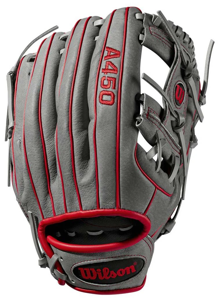 The A450 line of WILSON gloves are designed to look like Pro Stock model gloves worn by some of the top players in Major League Baseball.Color: Grey