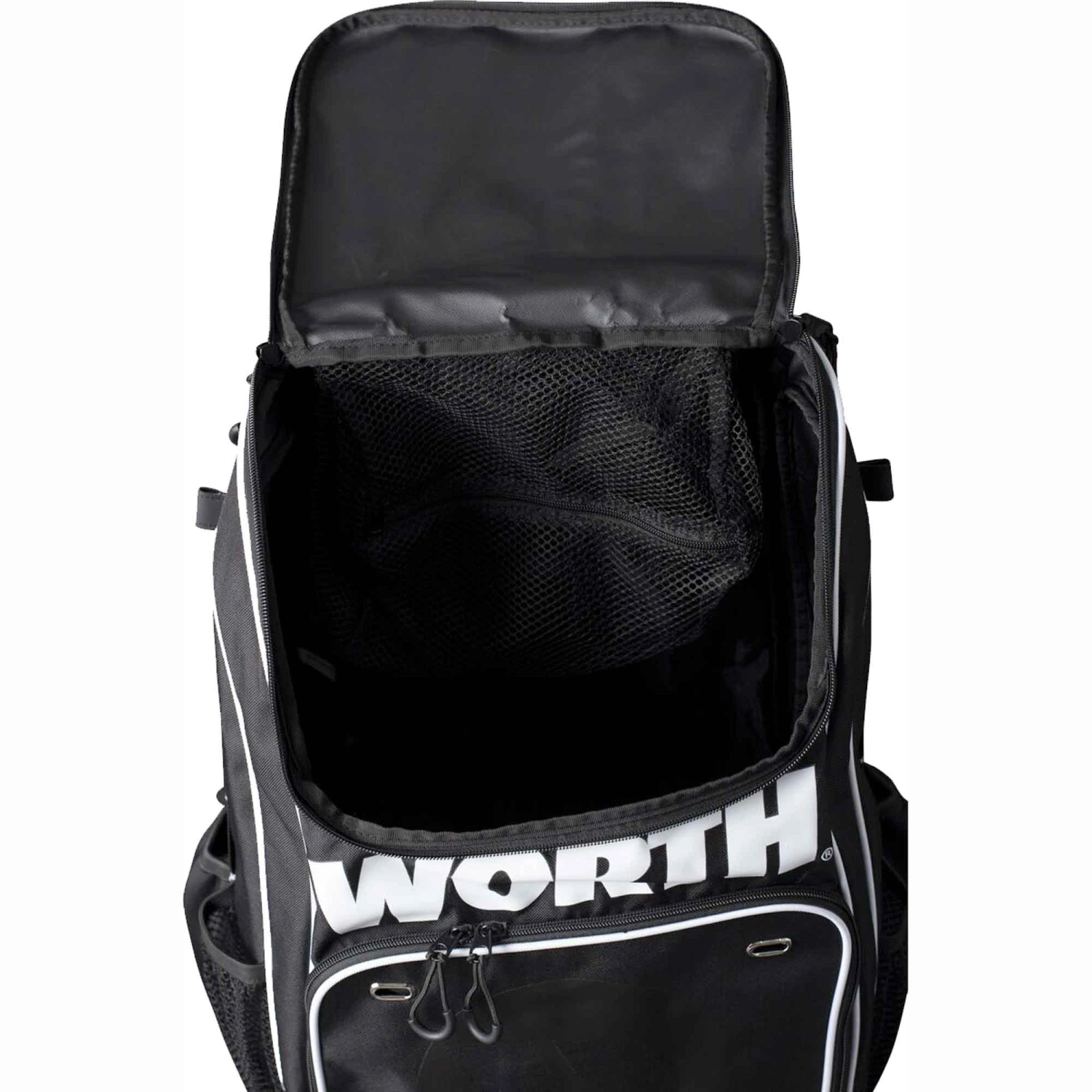 The all new Worth Backpack features 2 elasticized neoprene bat sleeves, a durable “J” style fence hook, a mesh zippered pocket inside top compartment, and a front storage compartment.