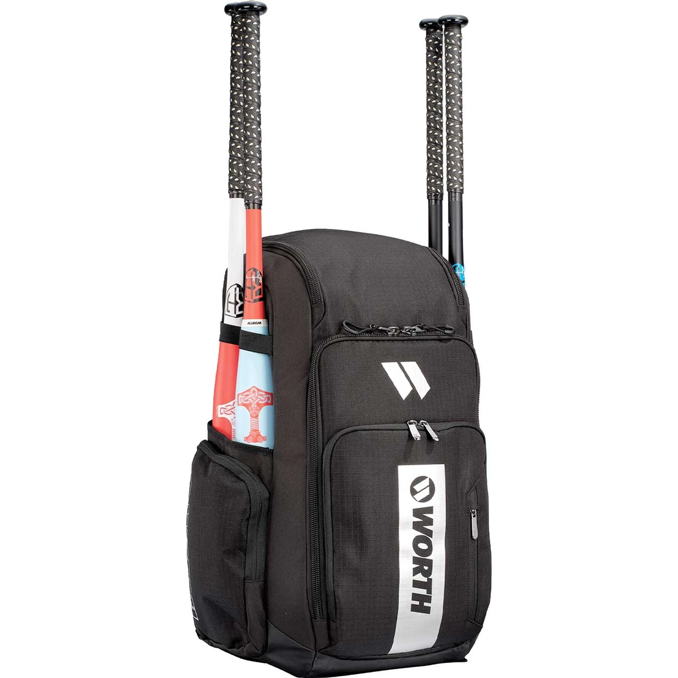 The Worth Pro Slowpitch Backpack was engineered specifically for slowpitch players who need a quality bag for their gear. First off, it has 4 individual bat sleeves on the sides so you can easily carry all you bats to the field. It’s also equipped with a large main compartment for helmets and other gear, and also features a top glove compartment to keep your glove safe and in game form. It has large, durable zippers too. This backpack is offered in a classic, stylish black design.